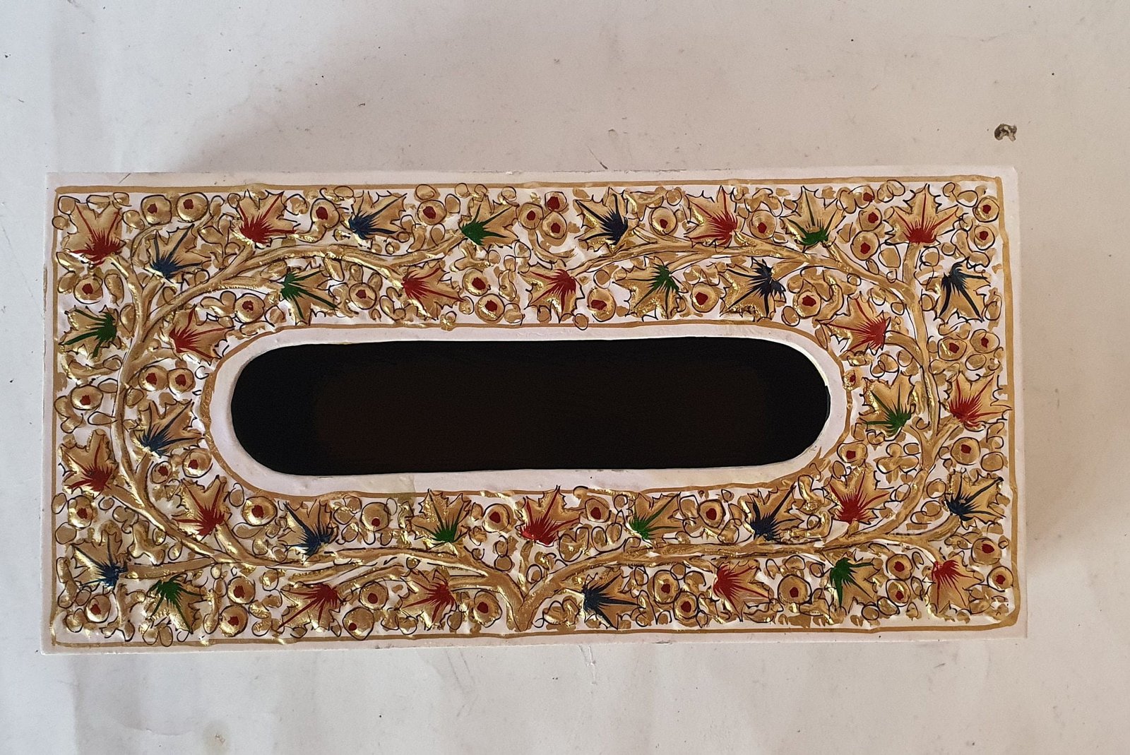 Description: Elevate your home or office decor with our unique and eco-friendly Paper Mache Napkin Box. Crafted from recycled waste paper board, this exquisite tissue box is not only sustainable but also a stunning work of art. Each box is skillfully hand-painted and embossed with intricate foliage inspired by the local sycamore tree, ensuring a one-of-a-kind piece.